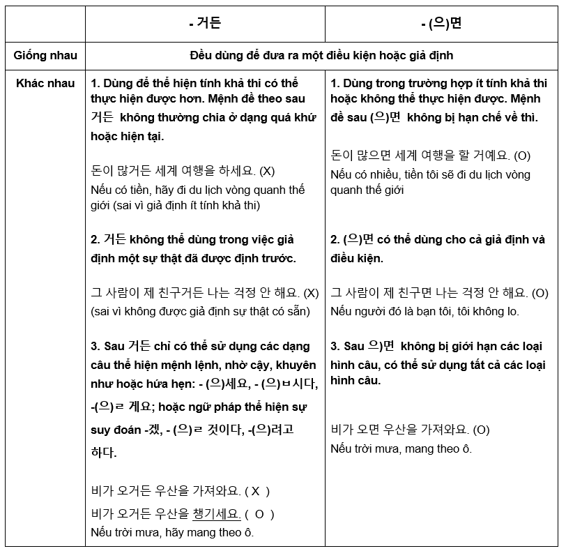 Vế sau 거든 thường là các ngữ pháp thể hiện mệnh lệnh, nhờ cậy, khuyên nhủ hoặc hứa hẹn: – (으)세요, – (으)ㅂ시다, -(으)ㄹ 게요; hoặc ngữ pháp thể hiện sự suy đoán -겠, – (으)ㄹ 것이다, -(으)려고 하다 thì câu sẽ tự nhiên hơn.