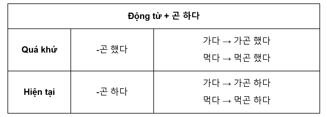 3. ‘- 곤 하다’ diễn tả ý thường xuyên làm việc gì đó như một thói quen. Tuy nhiên không sử dụng trong trường hợp diễn tả những hành động, những việc luôn luôn xảy ra một cách cố định, không thay đổi.