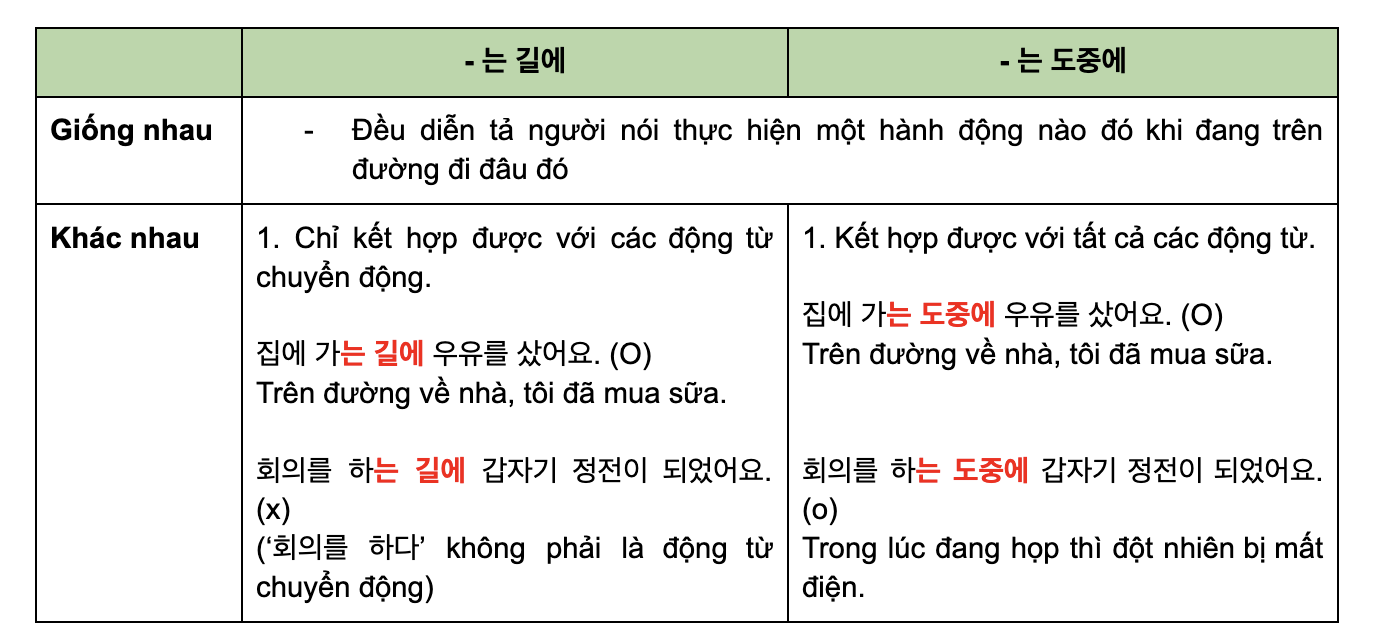 3. So sánh ‘는 길에’ & ‘는 도중에’