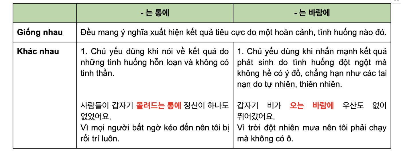 4. So sánh ‘-는 통에’ & ‘-는 바람에’