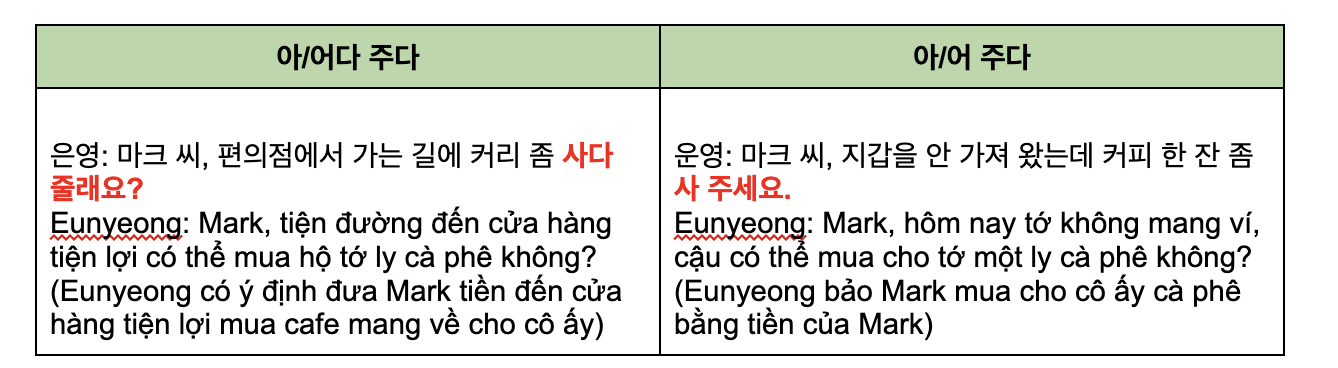3. Khi sử dụng biểu hiện này để nhờ cậy người khác thì dùng dạng ‘-아/어다 주다’, tuy nhiên cấu trúc này và ‘아/어 주다’ mang ý nghĩa khác nhau như sau:
