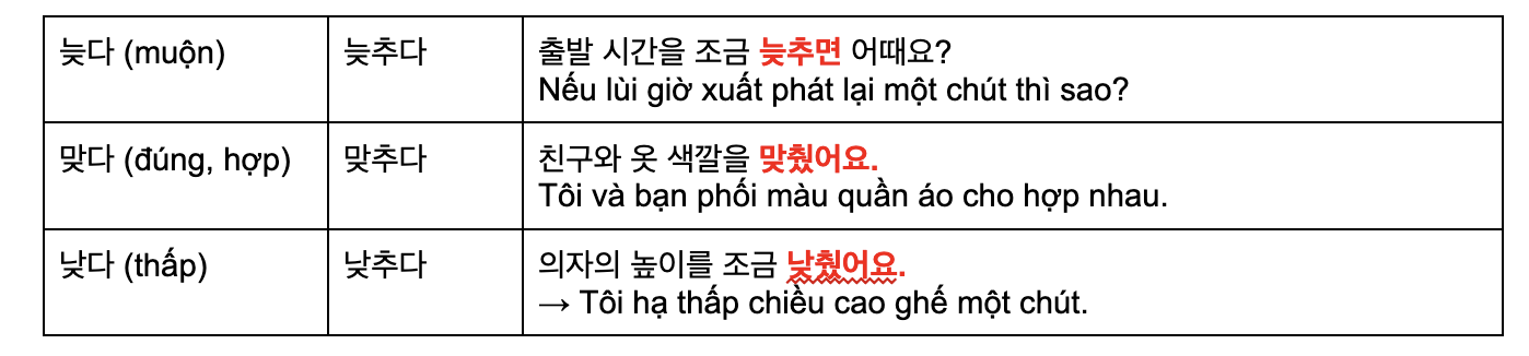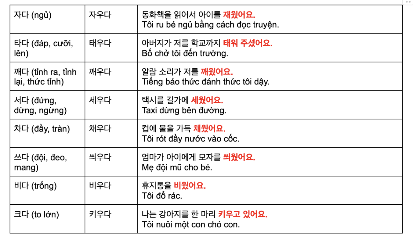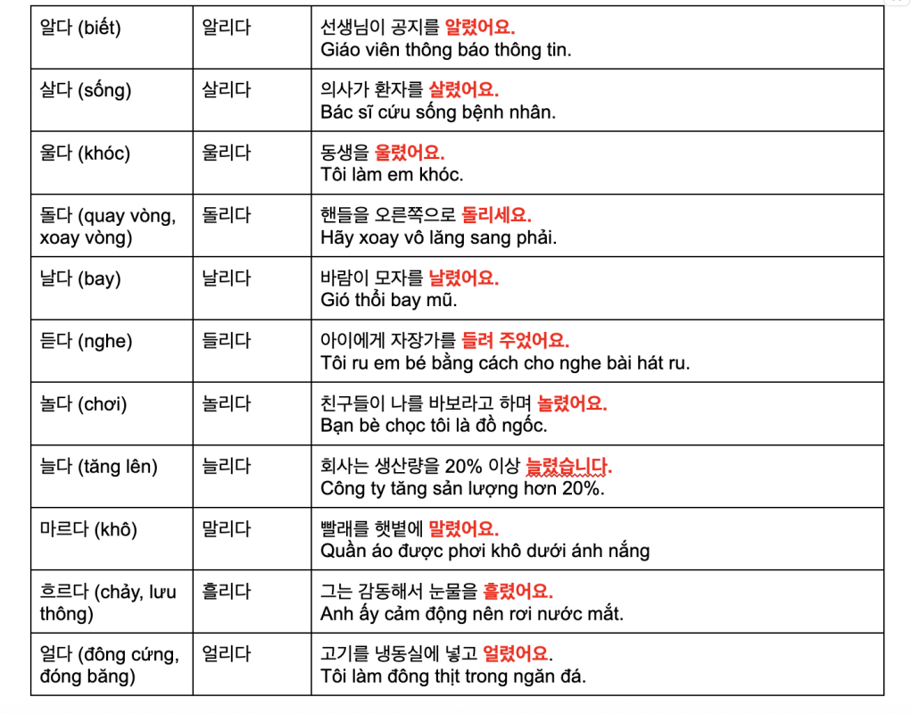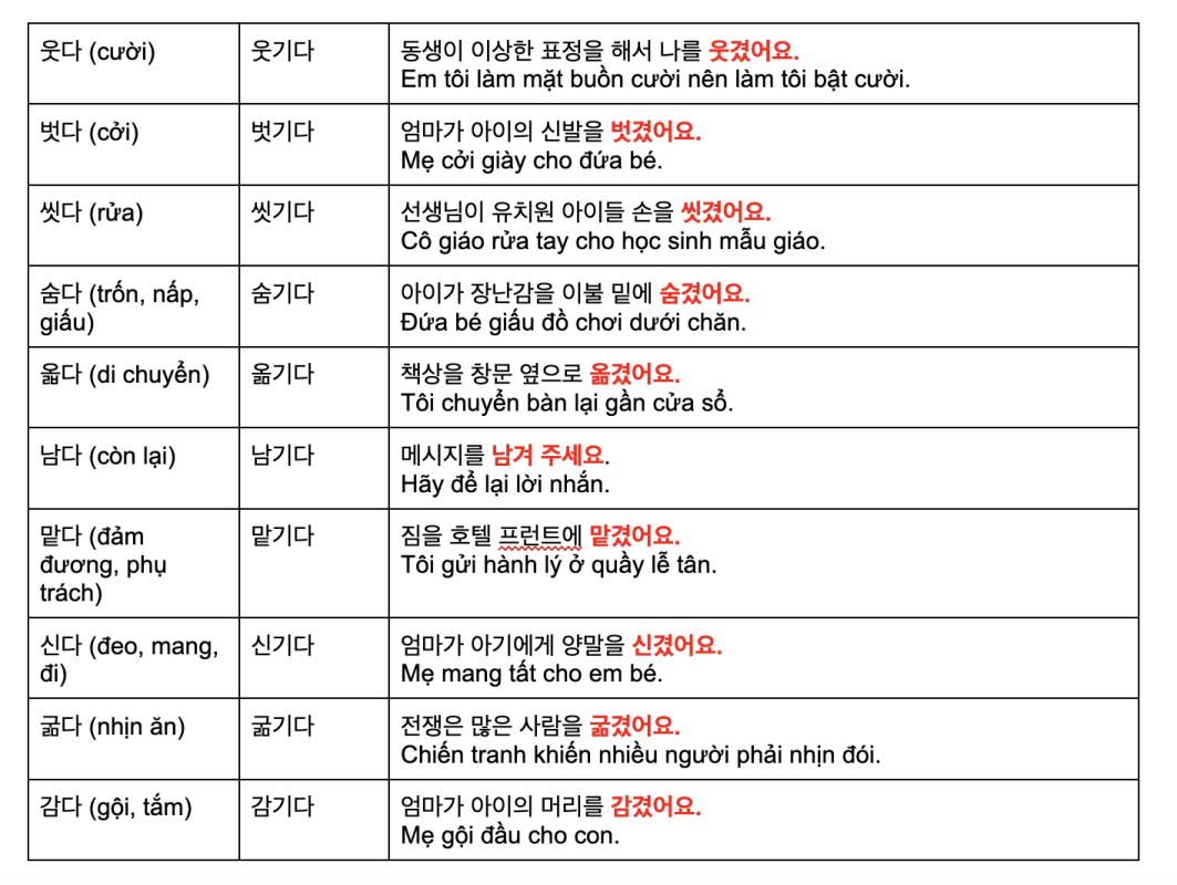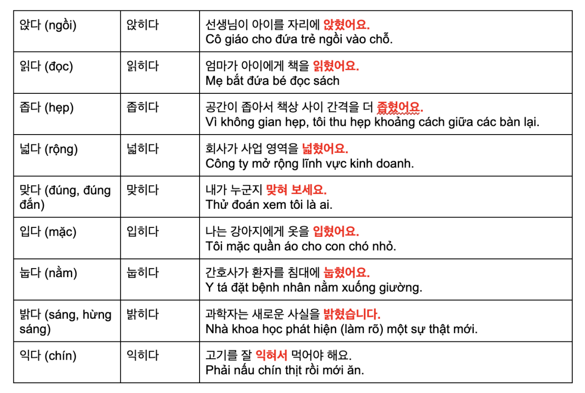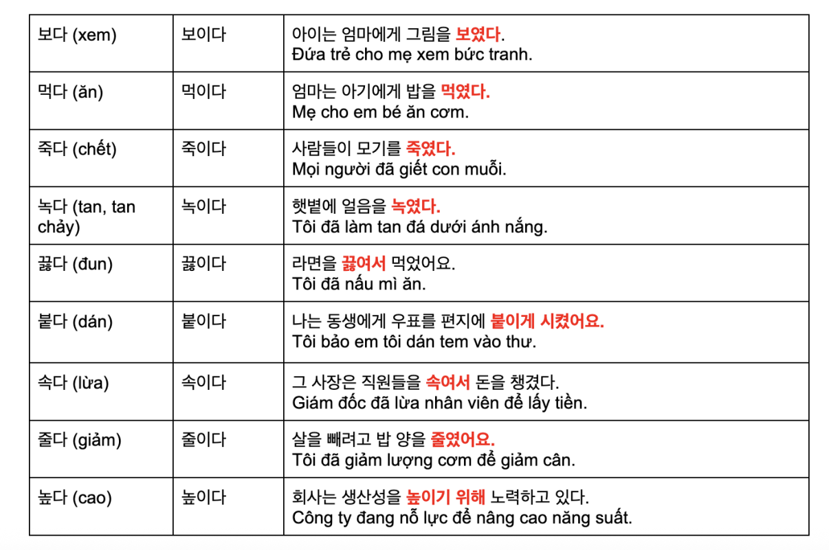 2. Động từ gây khiến dạng ngắn: được sử dụng khi chủ ngữ của câu trở thành chủ thể của hành động và trực tiếp thực hiện hành động đó. Sau thân động từ kết hợp với ‘-이/히/리/기/우/추’.