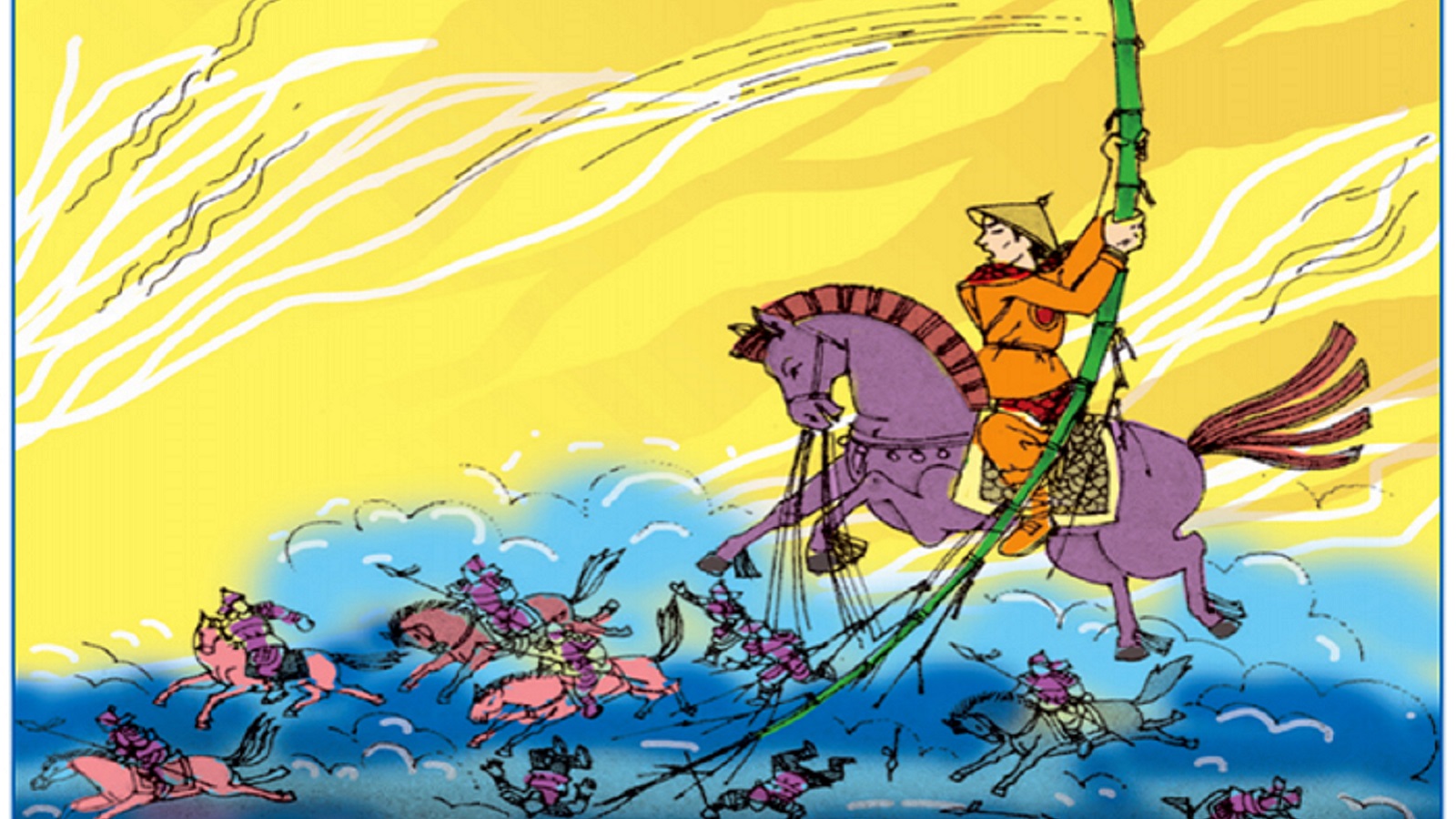 Quân Ân hùng hổ cũng không chống nổi sức mạnh của Gióng, chết như rạ, tướng giặc Ân vương cũng bị tiêu diệt. Khi gươm gãy, Gióng nhổ tre ven đường làm vũ khí tiếp tục quật tan tàn quân còn lại.
