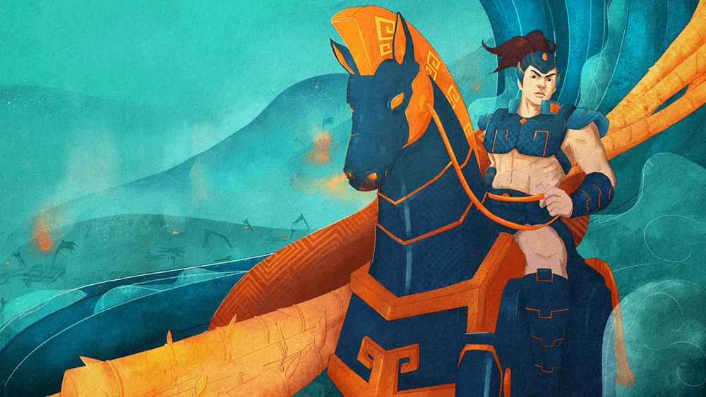 무기가 도착하자, 지옹은 갑옷을 입고, 투구를 쓰고, 칼을 잡고, 쇠말 등에 올라탔습니다. 그 순간, 지옹은 거대한 용맹한 장군으로 변신했습니다. 쇠말은 불을 뿜으며 전장으로 달려갔고, 불길이 적의 진영을 태웠으며, 지옹의 칼은 번쩍이며 적군을 무찔렀습니다.