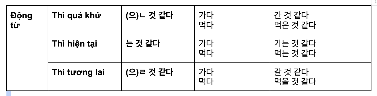 는 것 같다 chỉ sự suy đoán của người nói về trạng thái hoặc hành động xảy ra ở hiện tại. Biểu hiện này chỉ sự phỏng đoán không chắc chắn 100% của người nói , thường dựa vào trực giác hoặc hiện tượng trước mắt. Nghĩa tương đương trong tiếng việt là “hình như, chắc là”